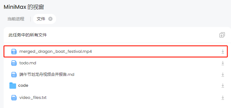 在 Minimax Agent 的工作视窗中,可以将合成好的视频下载到本地。