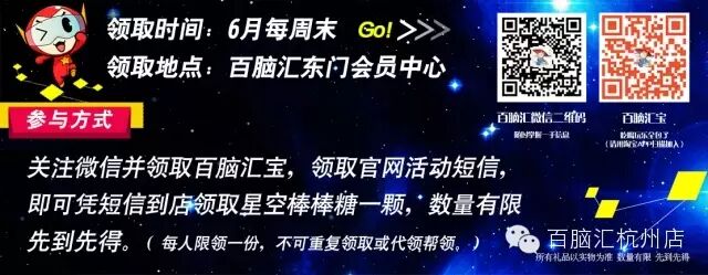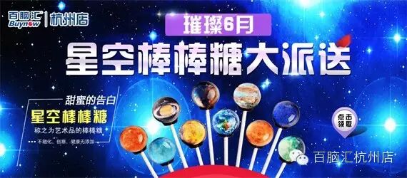 即日起关注百脑汇杭州店微信并领取百脑汇宝,下载官网活动短信或凭百脑汇台历6月剪角,即可在6月每周末至百脑汇领取星空棒棒糖一颗!(数量有限,先到先得。每人限领一份,不可代领帮领等)