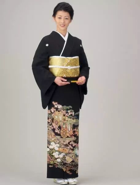 「留袖(とめそで)」,分为黑留袖和色留袖两类。黑留袖就是黑色的留袖,为已婚女性最正式的着装,在两胸前、两袖、背后有5个家纹,而只有三个家纹的为次正式的。未婚女性不能穿黑留袖。