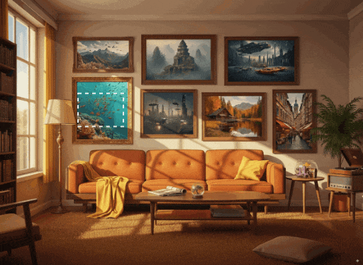 我们再来看一个官方案例。在一幅元素繁多的画面中,我们可以点选墙上的一幅海洋油画,进行增强和放大。