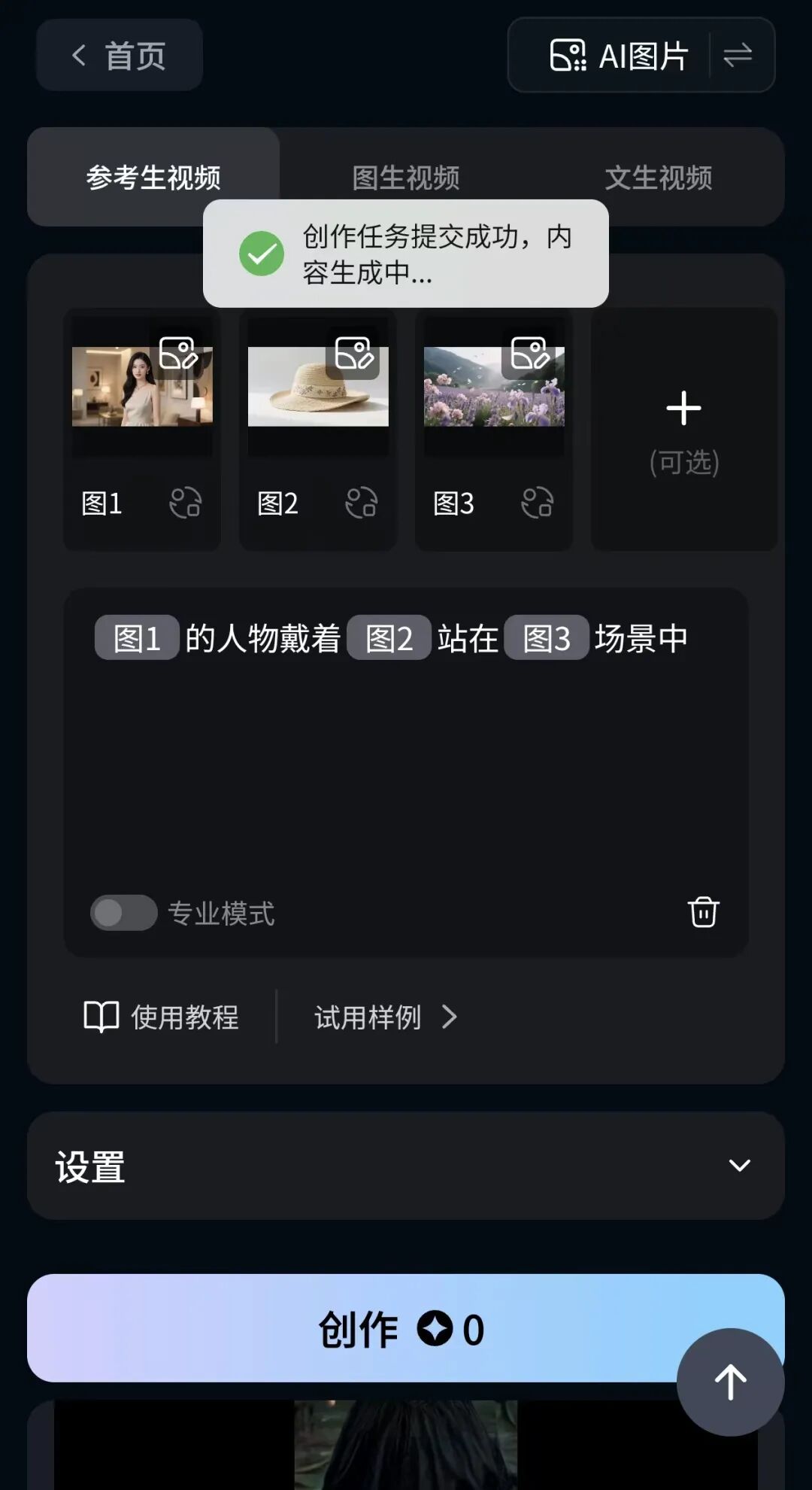 我们选择一个模板进行参考,上传三张以上的主体和场景图片。点击创作按钮后,任务会直接提交生成,并且不消耗积分。