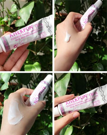 米白色慕斯质地,延展性很好也很细腻,一开始是涂上白白的乳液,要多搓一会才可以完全吸收。一颗黄豆大小的用量就足以涂满整个颈部。