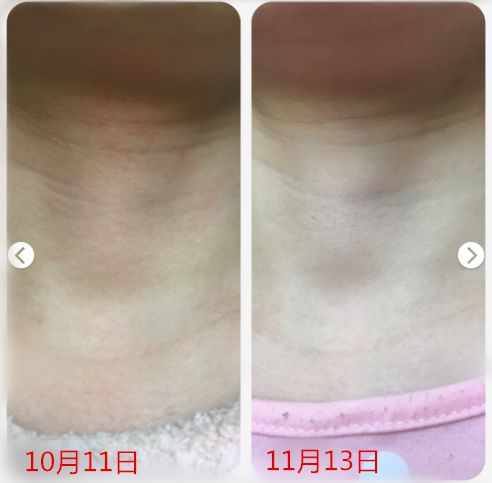 从照片可以看得出,脖子上细小的干纹已经消失了不少,较深的褶皱也稍稍变浅了些,而且颈部的皮肤也白嫩细腻了一点点,没有那样明显的黑色素沉积了。