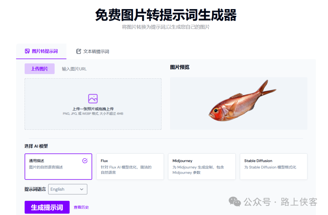 功能:上传图片生成自然语言提示词,支持多语言输出,每日5次免费额度