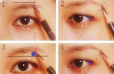 眉尾:位于嘴角和眼尾的延长线上,如果眉毛过长要修剪,过短就要用眉笔补色。