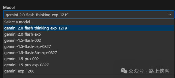 记得这边务必选择第二个模型gemini-2.0-flash-exp, ,第一个最新模型通过API绑定是无法使用的。