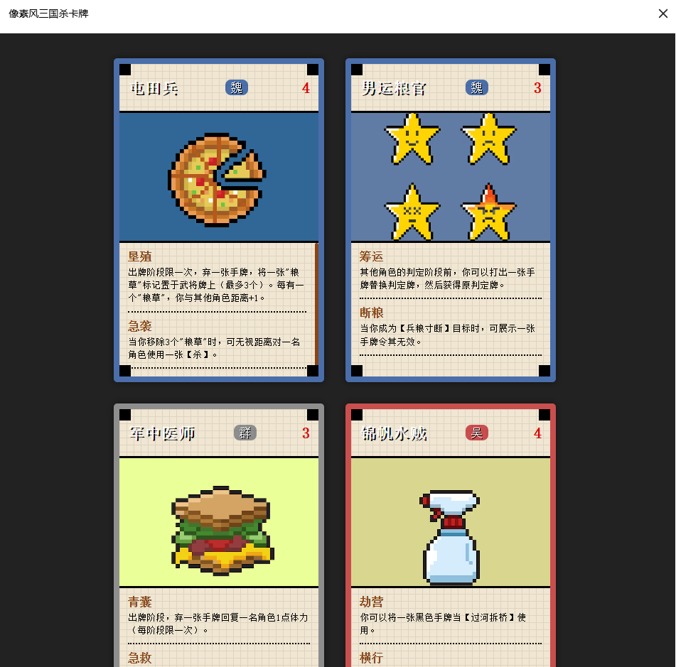 今天我们来尝试使用无代码编程的方式,设计一款具有三国杀主题和像素风格的角色卡牌游戏。