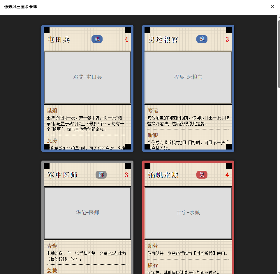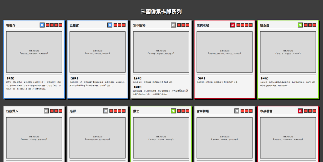 “请帮我设计一系列像素风格的游戏角色卡牌,模仿参考图片的游戏角色卡牌设计案例,设计一系列《三国杀》主题的像素风格游戏角色卡片。要求卡片保持像素风格的特点,并融入了中国三国时期的元素,包括角色穿着汉服、铠甲或符合时代的服饰;卡牌中的角色信息(如角色名、势力、体力、技能名及描述)要用中文呈现。接下来,继续为我设计更多不同身份或特点的三国风格角色卡片,形成一个系列。设计以下角色:1.屯田兵 (对应邓艾 - 强调后勤)2.男运粮官 (对应程昱 - 强调运输)3.军中医师 (对应华佗)4.锦帆水贼 (对应甘宁)5.铸剑匠 (对应蒲元)6.行商贾人 (对应张世平)7.庖厨 (对应厨师/美食家)8.谋士 (对应诸葛亮)9.宫廷舞姬 (对应貂蝉)10.水战都督 (对应周瑜)11.攻城都尉 (对应关羽-转为军事工程职能)12.轻骑兵(对应吕布)13.虎豹骑(对应曹纯)”