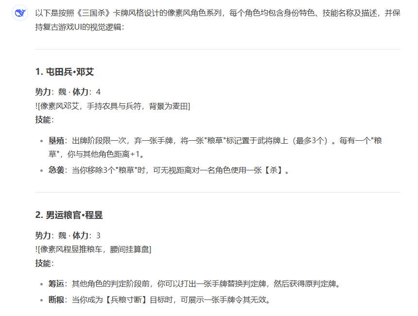Deepseek 根据提示词反馈了各个角色的设定信息,包括名称、势力、体力值以及技能描述等。