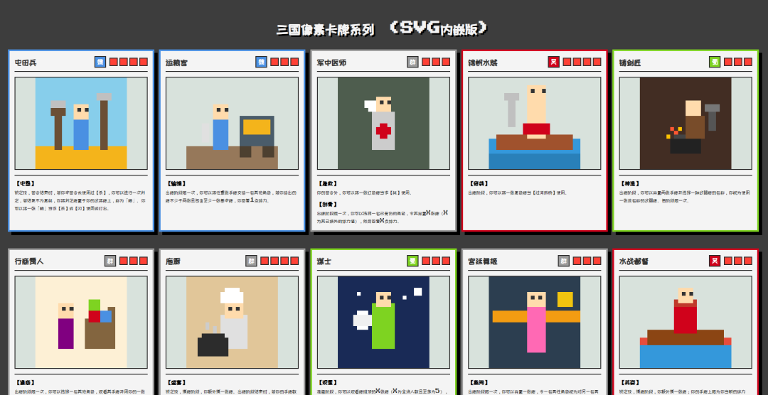 Gemini 根据这个思路生成的卡牌页面效果,包含了 SVG 绘制的像素风格角色图像,整体效果更佳。