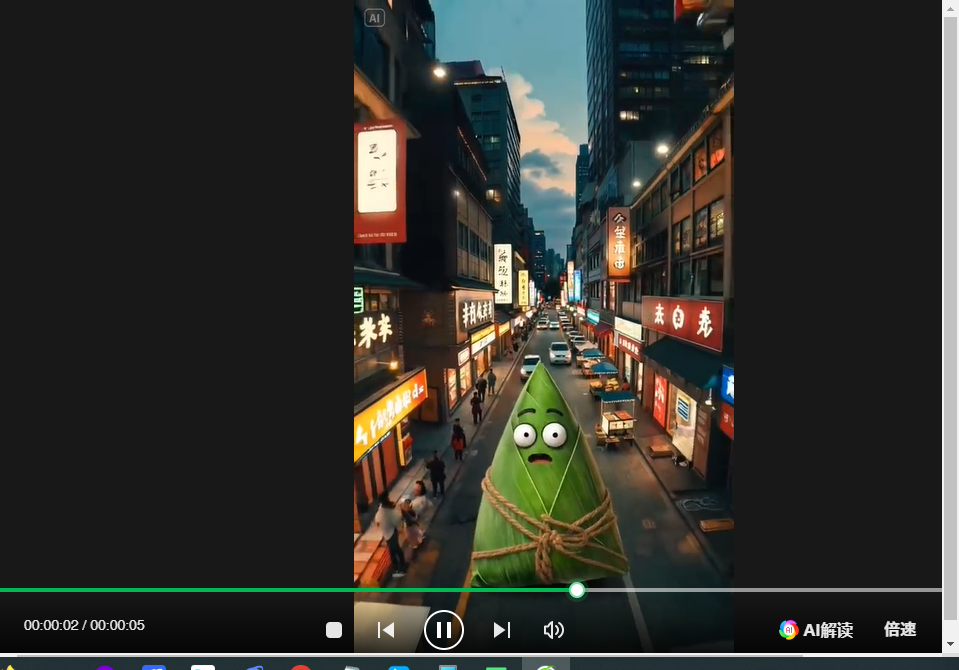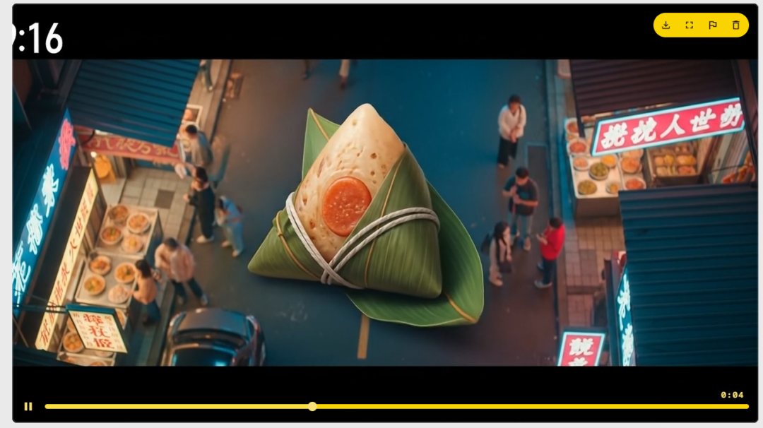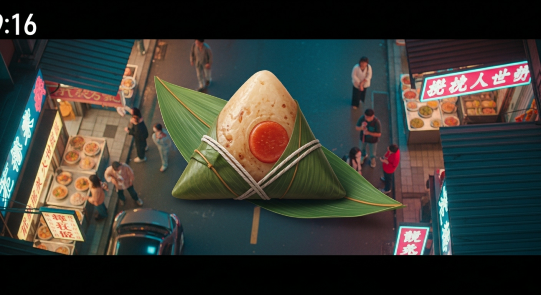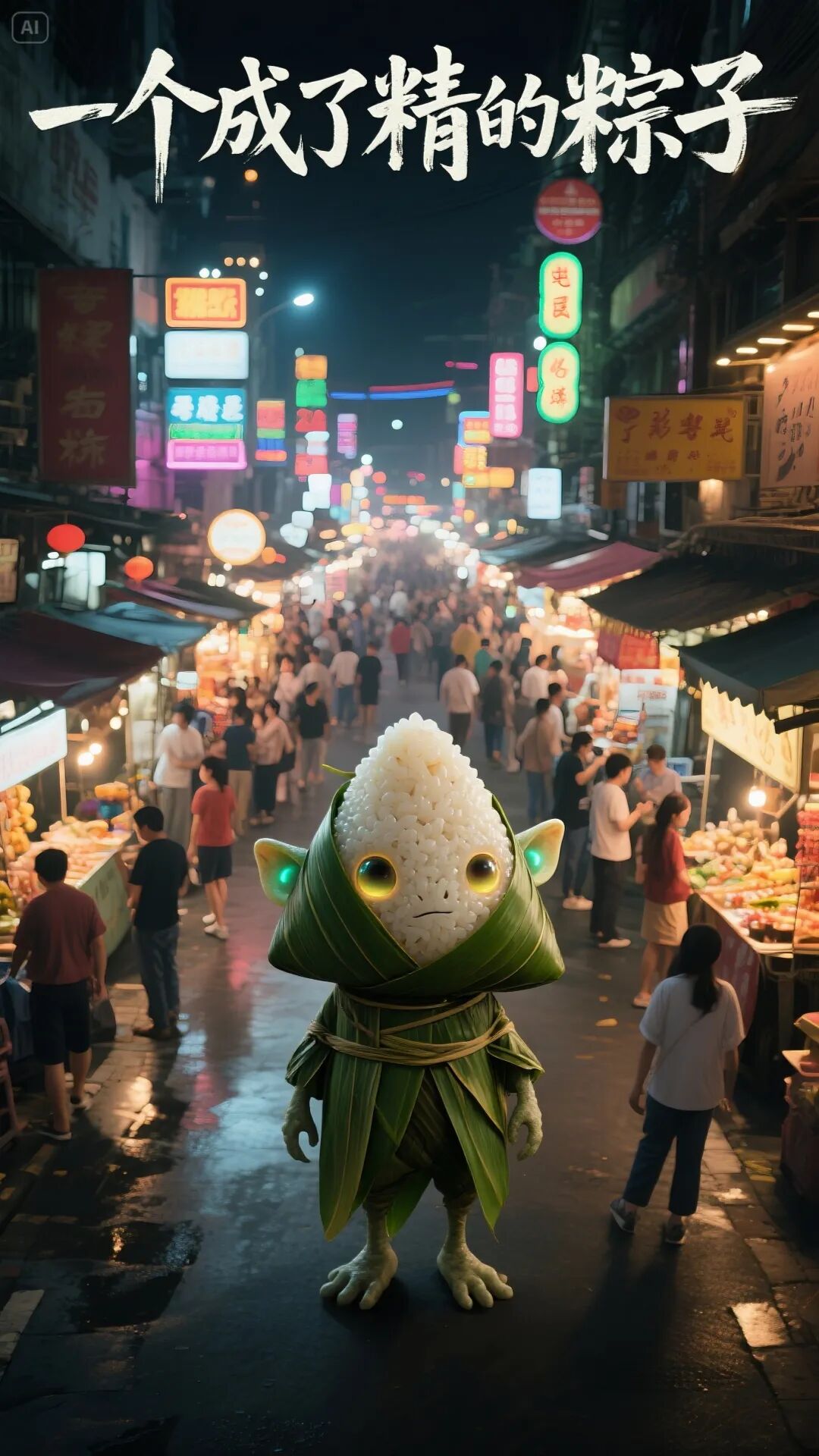 “一个关于“一个成了精的粽子”的视频,主要内容是“在人间的街道上闲逛”。 视觉风格:电影感。 场景设定在繁华的夜市。 主要动作为“探索与发现”。 镜头类型包括:广角镜头。 摄影机运动有:跟镜头, 无人机视角。 拍摄角度可采用:鸟瞰视角。 光照和氛围:霓虹闪烁的都市夜景。 色彩风格:梦幻般的柔和色彩。 宽高比:9:16竖屏。”