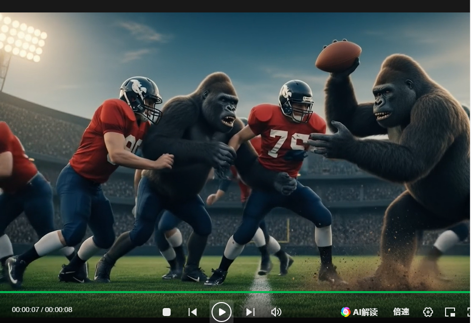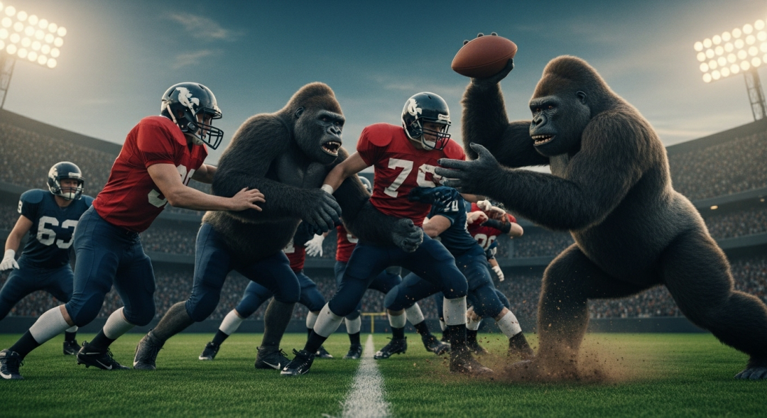 “Surreal hyperrealistic shot from an FPV ACTION CAMERA POV darting through a chaotic American football game. Humans and massive gorillas, helmets strapped awkwardly, clash on the same field under blistering stadium lights. The camera weaves between pounding cleats and fists. A gorilla barrels through a line, cradling the ball, tossing it overhead. Sweat and dirt fly. Filmed in 16mm film.”