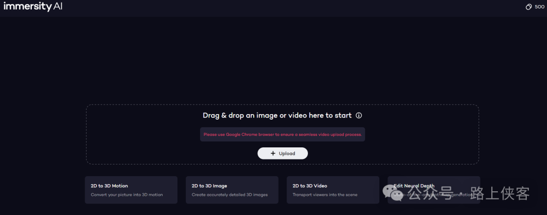 可以将2D图像或视频文件拖放到上传区域,或者点击从设备中选择文件的选项来上传需要转换的内容 。