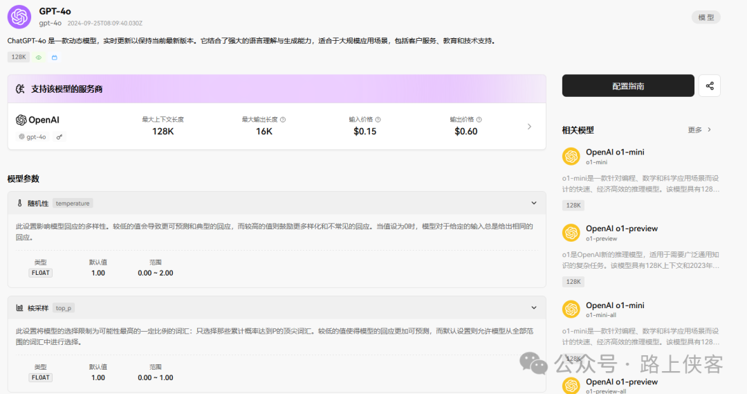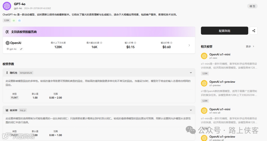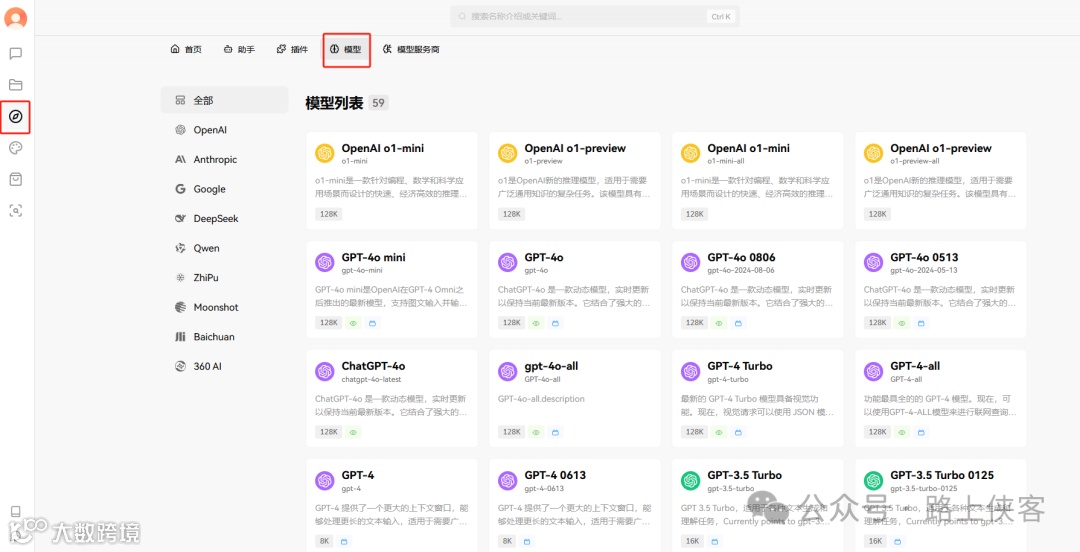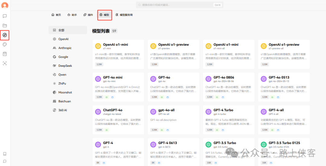 我们在左侧边栏的发现菜单中进入,在模型菜单标签中可以看到集成的大模型还是相当丰富的。包括最新的GPT-4o和GPT-4o mini。