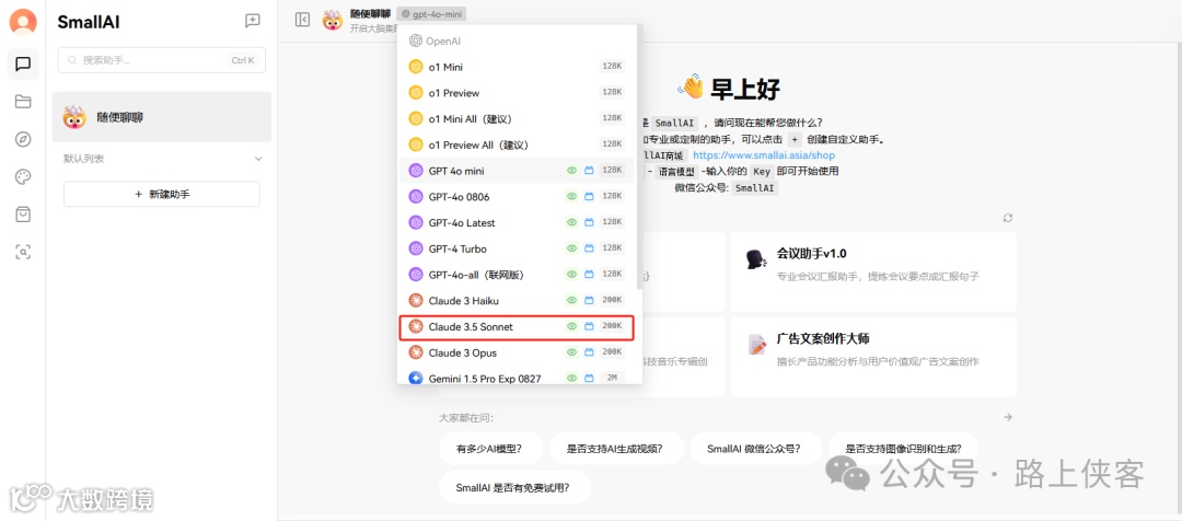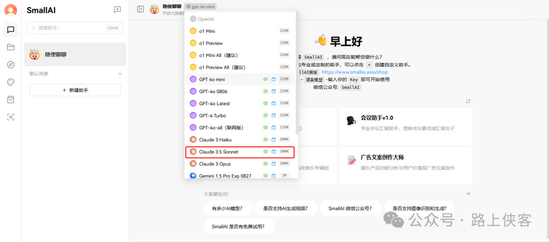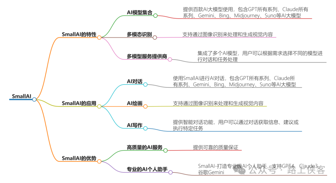 多模型集成:SmallAI集成了众多知名的AI模型,如OpenAI的GPT所有系列、Anthropic的Claude所有系列、谷歌的Gemini、微软的Bing、Midjourney、Suno等,还涵盖了国内全系列主流模型、向量模型(Embedding)、文生音频模型(Suno)、AI绘画模型(DallE3、Midjourney)、文生视频模型(luma - video)等超过140款AI模型。这意味着用户在一个平台上就可以使用多种不同类型和功能的AI模型,满足多样化的需求,无论是进行文本对话、图像识别与生成,还是音频、视频相关的创作等都可以实现 。