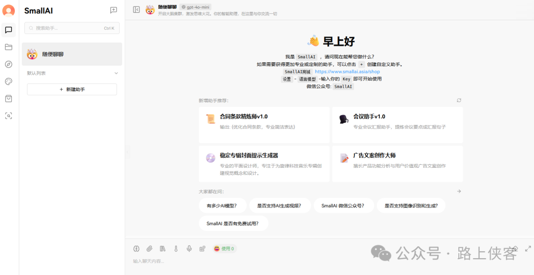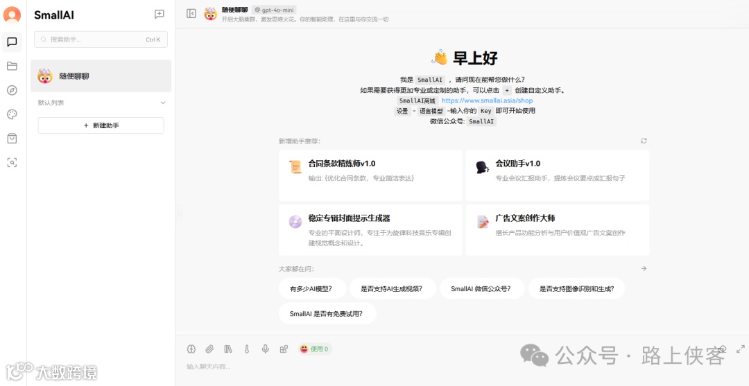 免费体验与多种服务:SmallAI公益站支持无限制免费体验GPT - 4o mini模型。同时,它还提供SmallAI Key、APIKey等服务,用户可以根据需求选择购买相关服务。此外,平台支持多模态识别、文件上传、联网等功能,例如在进行AI对话时,可以通过图像识别来处理和生成视觉内容,这为用户提供了更加丰富和全面的交互体验 。