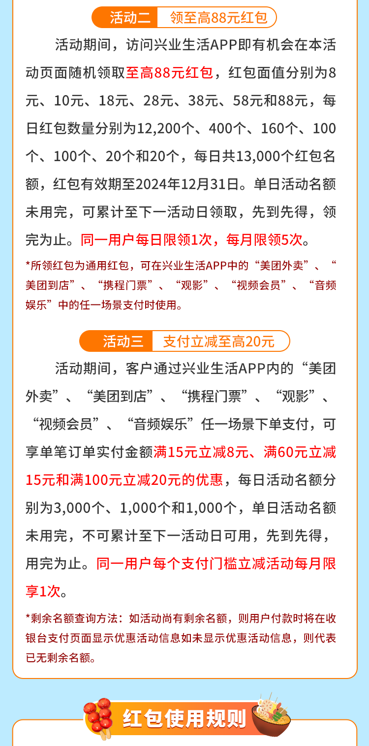 3.有效期:成功领取后红包将实时导入用户的兴业生活APP账户,红包有效期至2024年12月31日。红包过期自动失效,无法按期使用的红包不予补发。