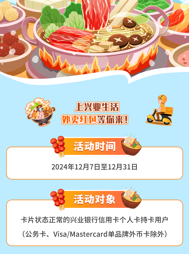 1.本活动限卡片状态正常的兴业银行信用卡个人卡持卡用户参加(公务卡、VISA/MASTERCARD单品牌外币卡除外)。