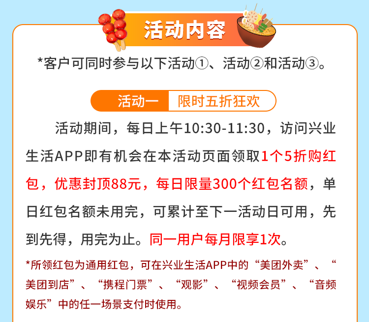 2.用户需提前下载兴业生活APP或将APP升级至最新版本并实名绑定后方可参加活动。