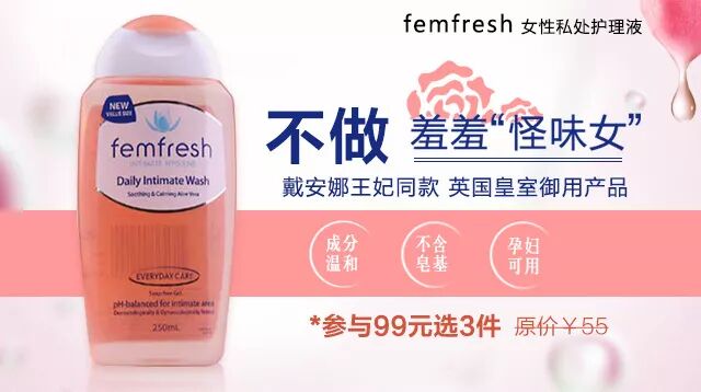 本周跨境美屋测评好物优选限时特价,原价55元的Femfresh私处护理洗液,限时参与专区任选3件99元活动,每瓶立省22元,空前低价不容错过哦!
