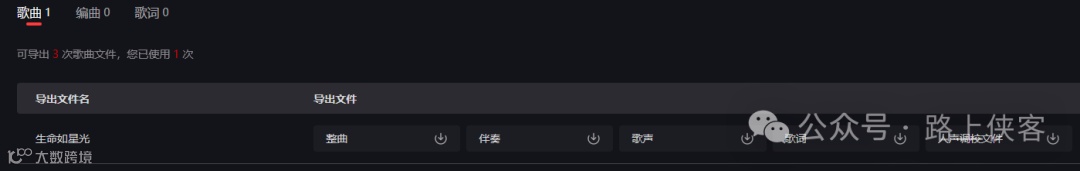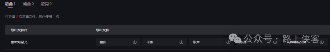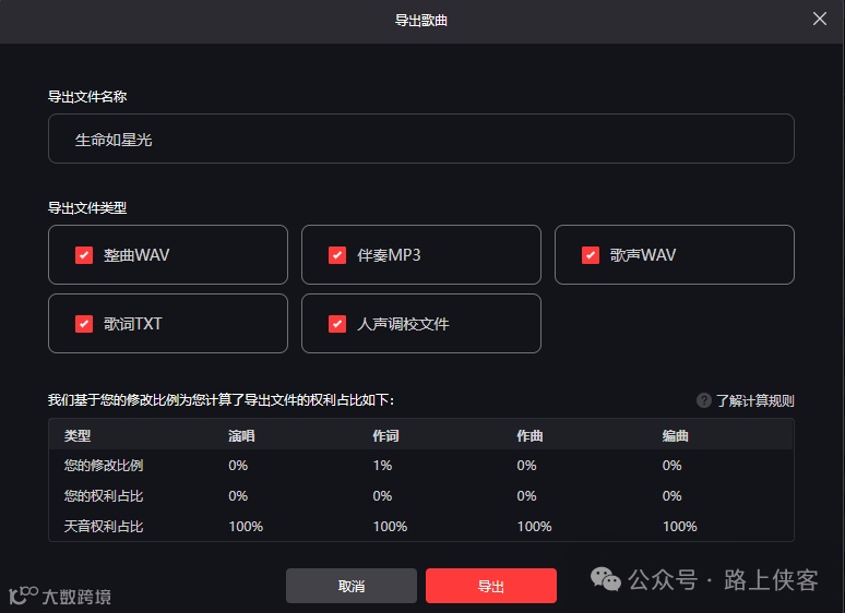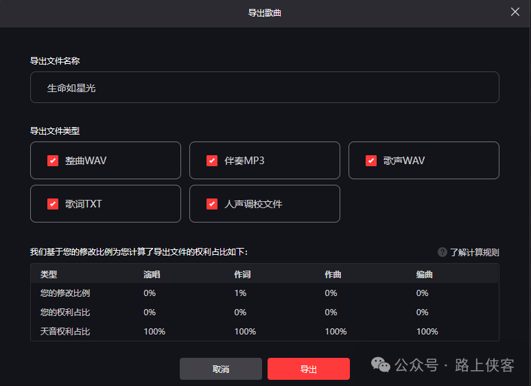可以对整曲、伴奏、歌声、歌词、人声调校文件分别单独导出。