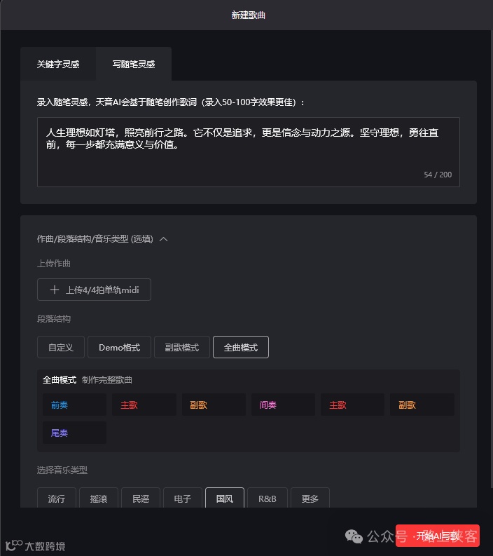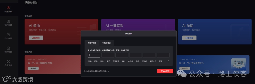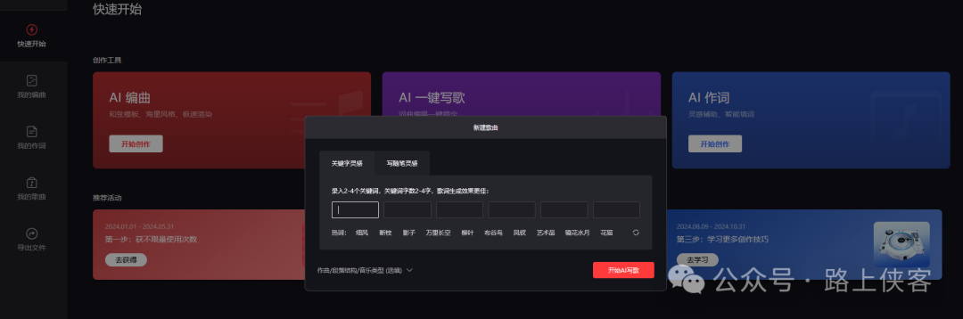 关键词输入:如果用户想要使用AI一键写歌功能,可以录入2 - 4个关键词,关键词的字数限制在2 - 4字之间。这些关键词可以是表达情感的词汇,如“快乐”“孤独”,也可以是与音乐风格相关的词汇,如“民谣”“电子”等 。