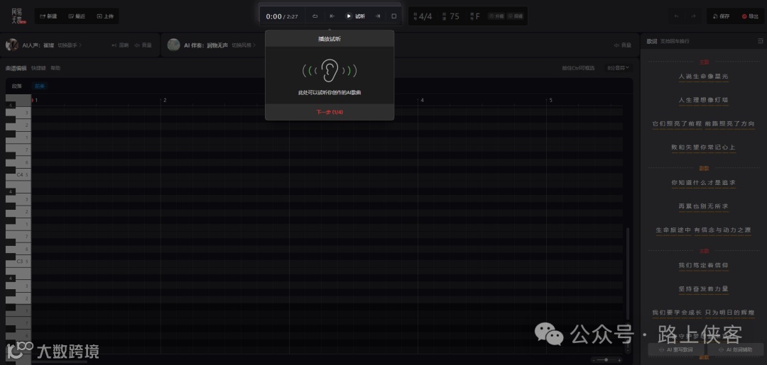 一、网站性质 https://tianyin.music.163.com 是网易天音的官网。网易天音是网易云推出的一款一站式AI音乐创作工具 。它主要面向音乐爱好者和创作者,为他们提供了一个利用人工智能进行音乐创作的平台。在当今的音乐创作领域,随着科技的发展,AI技术逐渐融入其中,网易天音就是在这样的背景下诞生的。它的出现为那些可能没有深厚乐理知识但又渴望创作音乐的人提供了机会,同时也为专业音乐创作者提供了一种新的创作辅助工具。