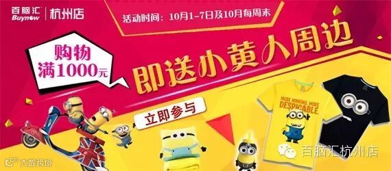 关注百脑汇官方微信,在商场内任意购物满1000元,即可凭购物小票参与活动,赢取超萌小黄人迷你水杯、小黄人T恤、小黄人迷你公仔等相关周边礼品。