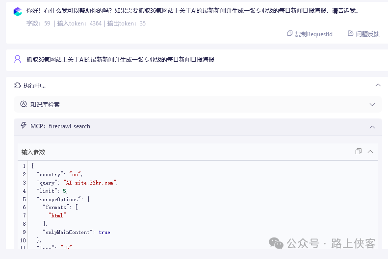 观察 MCP 的运行情况,可以看到智能体正在调用 Firecrawl 服务抓取指定网页的内容。
