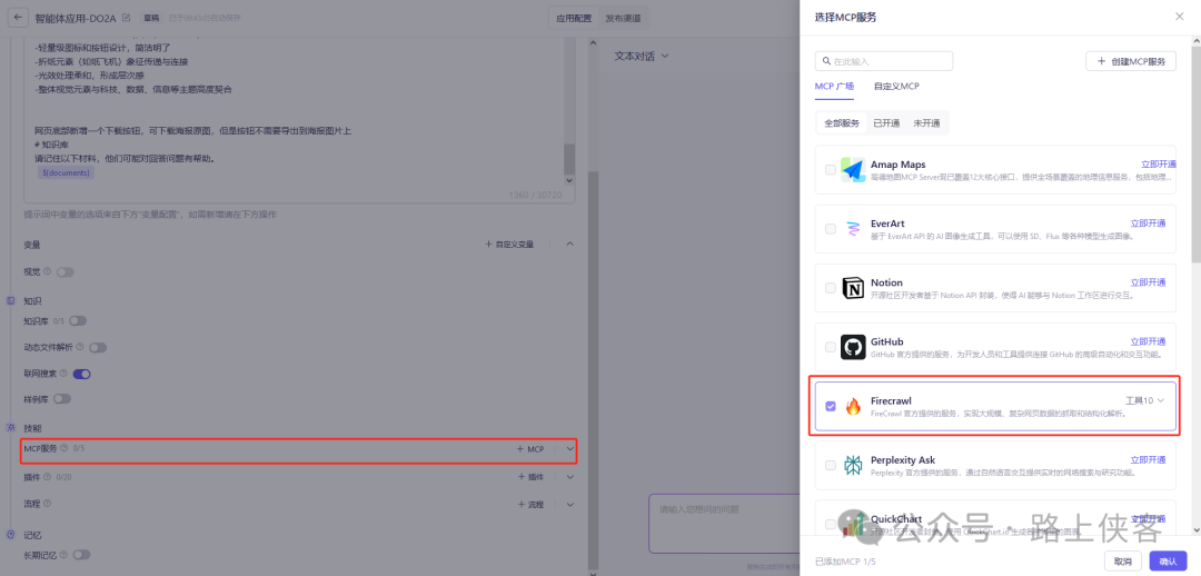 最后,将配置好的 Firecrawl MCP 服务添加到智能体的可用工具列表中。