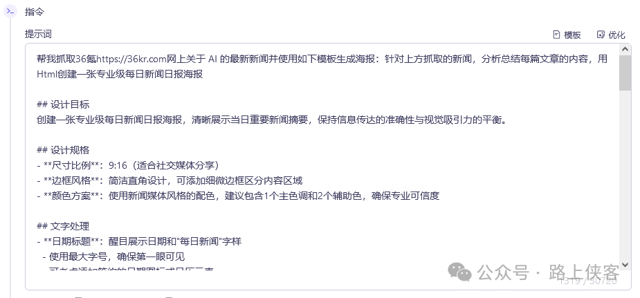 为智能体设置合适的提示词 (Prompt),指导它如何使用工具进行新闻抓取和生成海报。