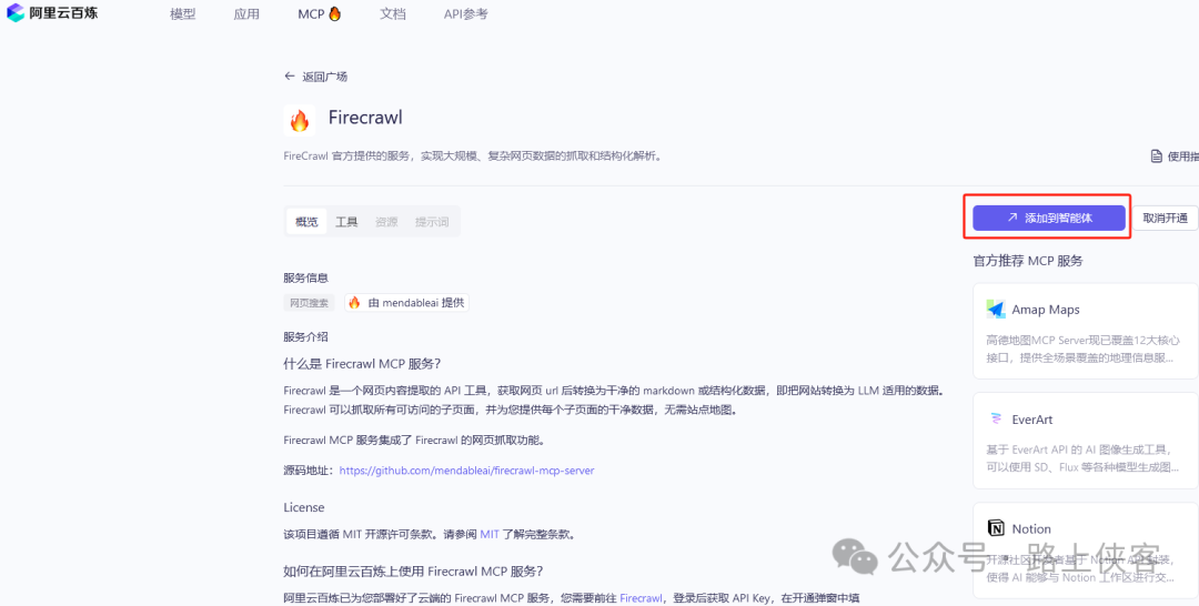 首先,在阿里云百炼平台中找到“模型广场”下的“模型上下文协议 (MCP)”菜单项,然后在服务市场中找到 Firecrawl MCP 服务。