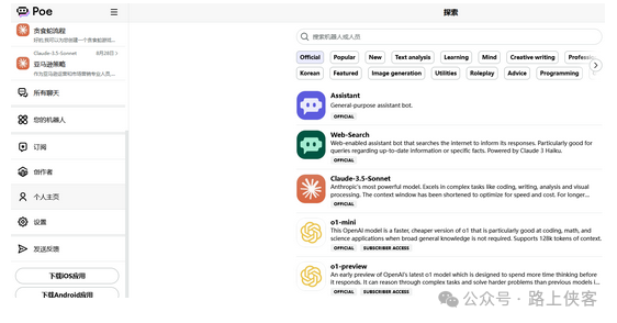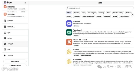 选择聊天机器人:注册登录后,如果只是想简单地进行聊天问答或者内容创作,在Poe AI的界面左侧可以随意切换各种聊天机器人。例如,如果想使用ChatGPT、Claude等不同的机器人进行提问,直接在列表中选择相应的机器人即可开始对话。