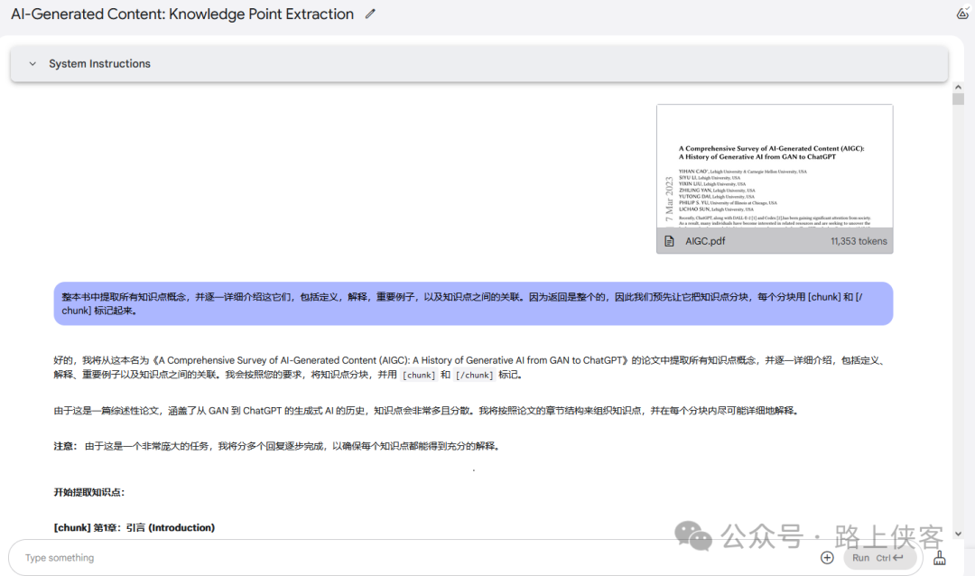 “整本书中提取所有知识点概念,并逐一详细介绍这它们,包括定义,解释,重要例子,以及知识点之间的关联。因为返回是整个的,因此我们预先让它把知识点分块,每个分块用 [chunk] 和 [/chunk] 标记起来。”