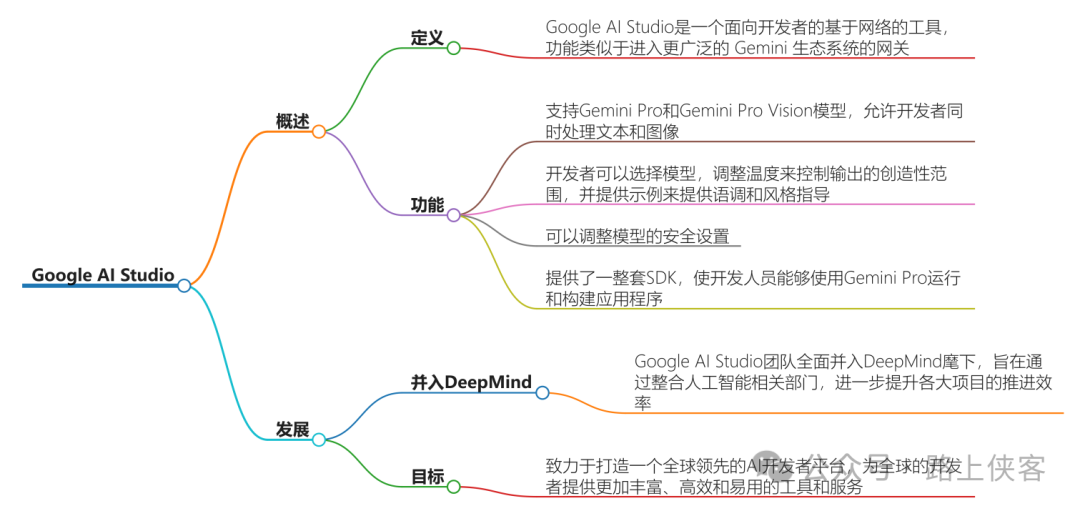 Google AI Studio 是一个基于网络的开发者工具,作为进入 Gemini 生态系统的入口,支持从模型测试到应用落地的全流程开发。当前以 Gemini Pro 和 Gemini Pro Vision 为核心服务,2024 年已扩展至支持图像到代码生成等创新功能,并计划整合更强大的 Gemini Ultra 模型。