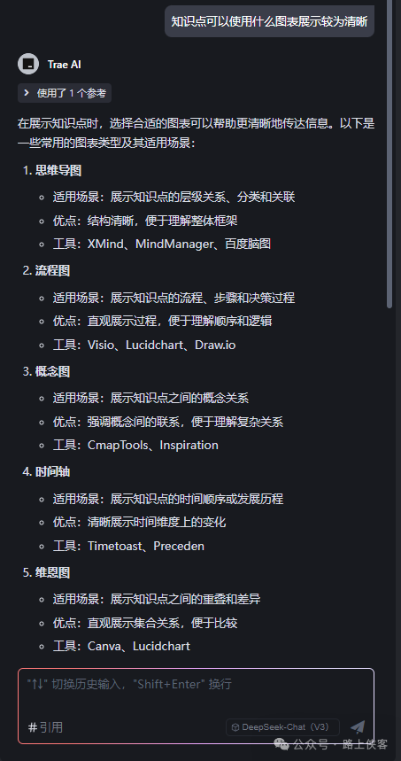 到了这里,可能有小伙伴要问我如何决定选取这几个图表来展示内容的?其实路上侠客也不知,我们直接问ai即可,这边选择的是Trae中的Deepseek V3模型。