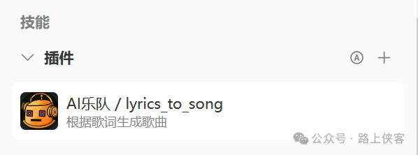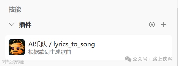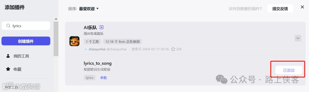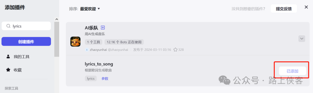 然后,在机器人中引用添加所需的音乐相关功能插件,检索lyrics并找到AI乐队这个插件,点击添加按钮加入上述创建的AI对话机器人。