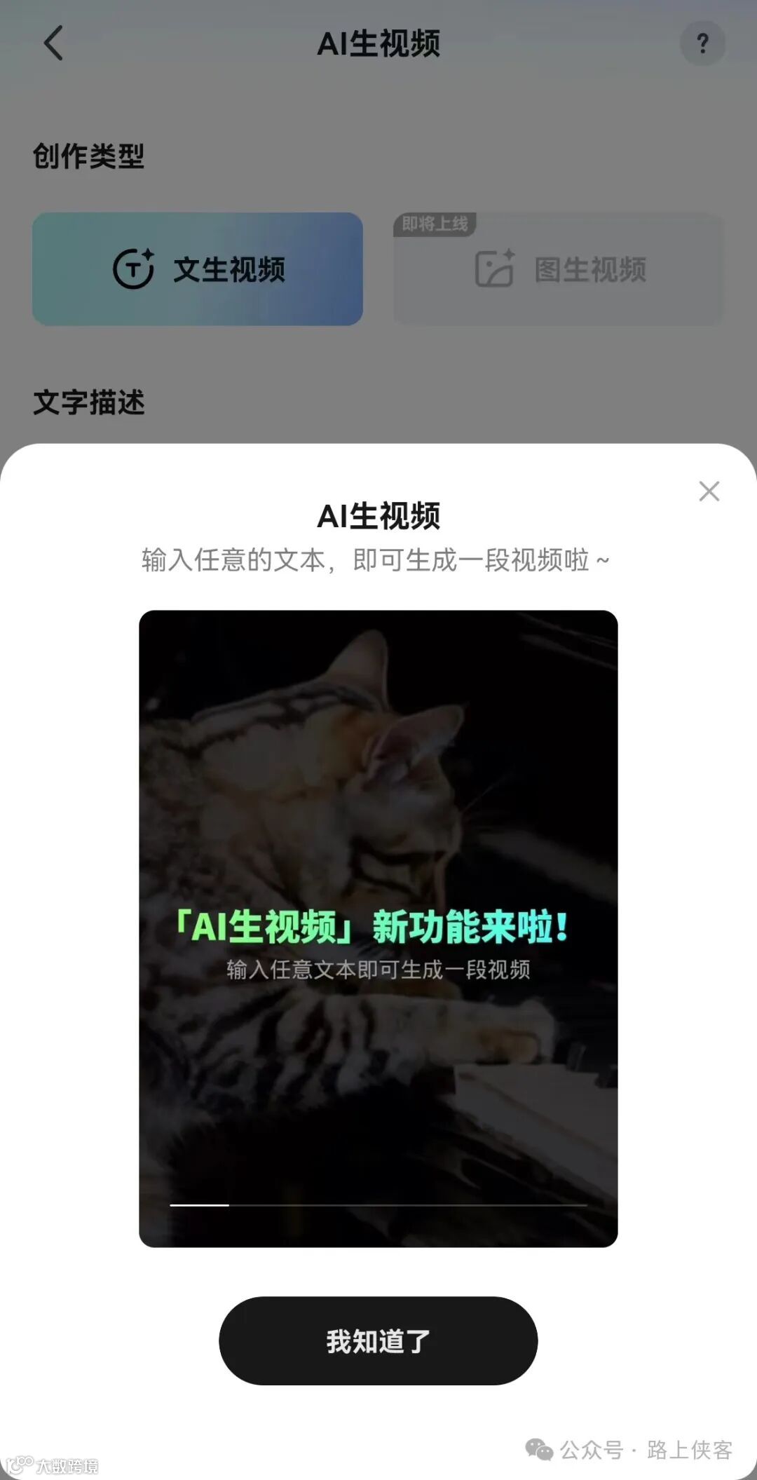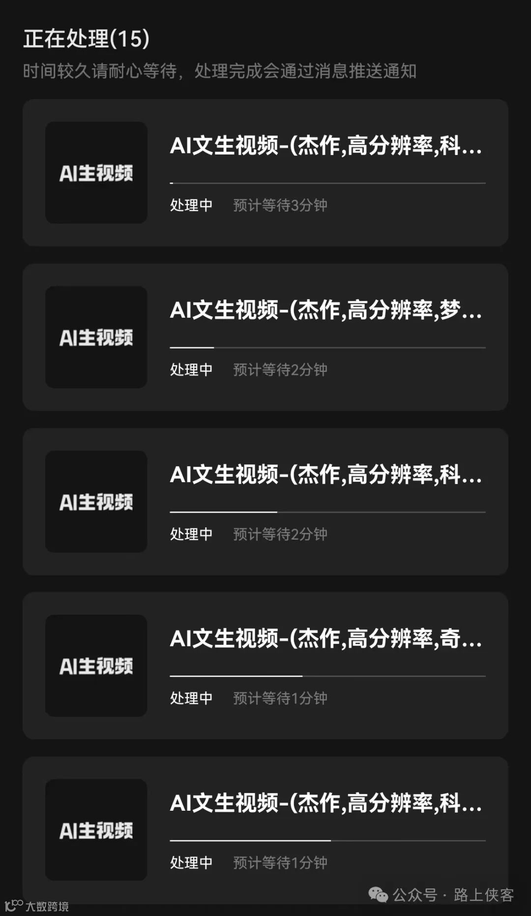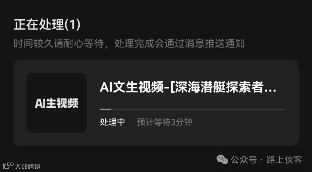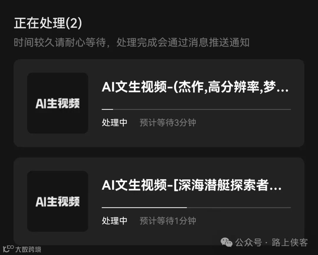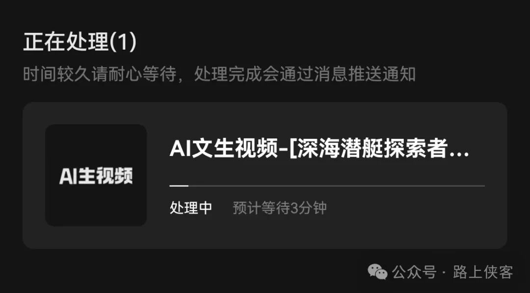 每次点击生成视频按钮,就会有一个AI驯服中的状态页面,这边大家可以知道下,路上侠客测试过了,你无需等待这个匹配过程达到100%然后退出,你可以忽略它直接回到视频生成主页面继续你的下一个视频创作,是不会影响视频生成的。