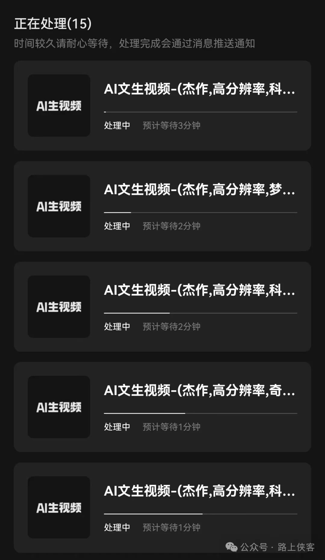测试了视频的生成等待时长,一般需要3分钟。一则视频在生成中可以在操作加入其他视频生成,形成一个等待生成的列表,路上侠客最大加到了15则视频也是OK的,有兴趣的小伙伴可以测试下极限值。这样的话在视频生成工作效率上得到了大大的提升,国外的很多AI文生视频大多都只能加入4个视频同时处理。就这一点可灵就已经很了不起了。