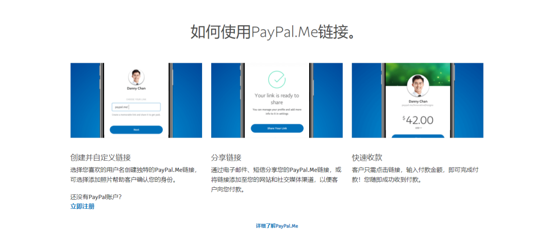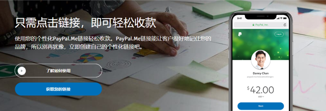 PayPal.Me是一种与您的企业账户相联的个性化链接。您仅需为自己或您的企业创建独特的自定义链接,分享出去即可轻松收款。这意味着,您无需再进行繁琐的银行转账,可轻松享受PayPal的安全付款。