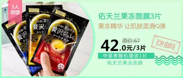 cosme榜单上排名第一,每片饱含33g美容液,比普通面膜更能滋润干燥肌肤。3种功效,全效改善你的肌肤!蓝色双重胶原蛋白,保湿紧致;红色双重玻尿酸,深层补水;金色富含蜂王浆,恢复肌肤饱满弹性。一次拼团,让你集齐3种功效面膜,每单中奖者还能多得一片哦!
