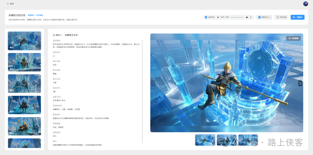 一个分镜画面中有3个可选镜头,然后一键可以生成视频。