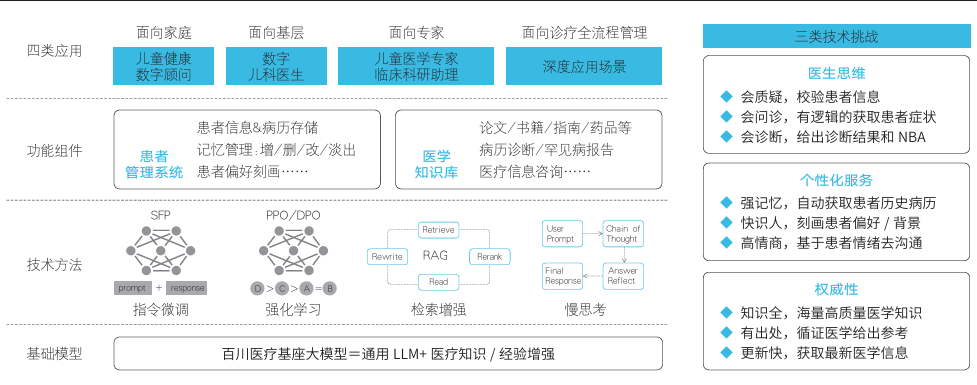 北京儿童医院的AI儿科医生,涵盖“一大四小”结构。北京儿童医院院长助理徐新介绍说,“一大”是指“福棠·百川”儿科大模型,是基于深度学习、自然语言处理及多模态数据处理技术构建的医疗人工智能系统,旨在实现儿科诊疗全流程的智能化决策支持。核心架构整合超过300位权威儿科专家临床经验,通过结构化临床推理范式训练,构建起覆盖儿童常见病与疑难病症的立体化知识体系。