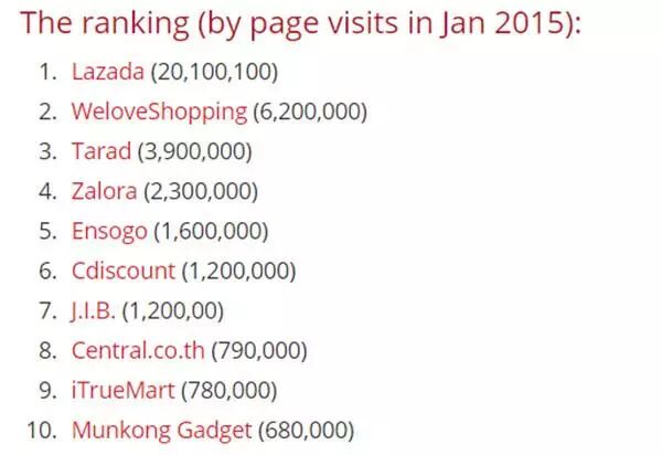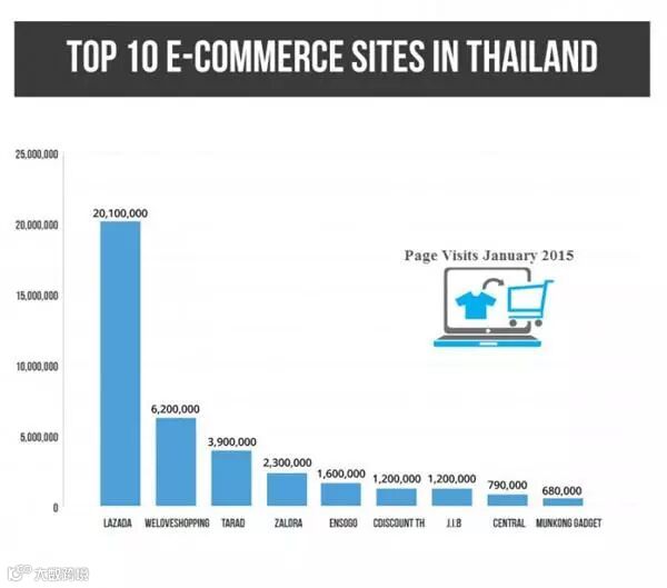 根据SimilarWeb按台式机访问量排名,这些平台必须是位于且在泰国国内操作,同时该台式机访问量是以产品销售为准的,不包括一些服务网站如订票、宾馆预订以及全球性的电商平台如亚马逊和eBay。虽然这个方法对于测试电子商务风险并不是很完善,但是这个方法向在零售行业的人提供了一个讯息,就是在泰国电子商务领域目前的一个竞争状况。