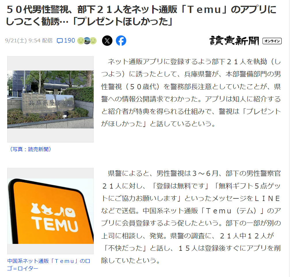 今年 3 月至 6 月期间,日本兵库县一位男警长通过line等在线聊天工具要求属下在 Temu 的应用程序上注册成为会员,参与“砍一刀”活动。砍一刀的风最终还是吹到了日本,也让日本中老年人体验了一把砍一刀的“快乐”。Temu的砍一刀功力不可谓不深。