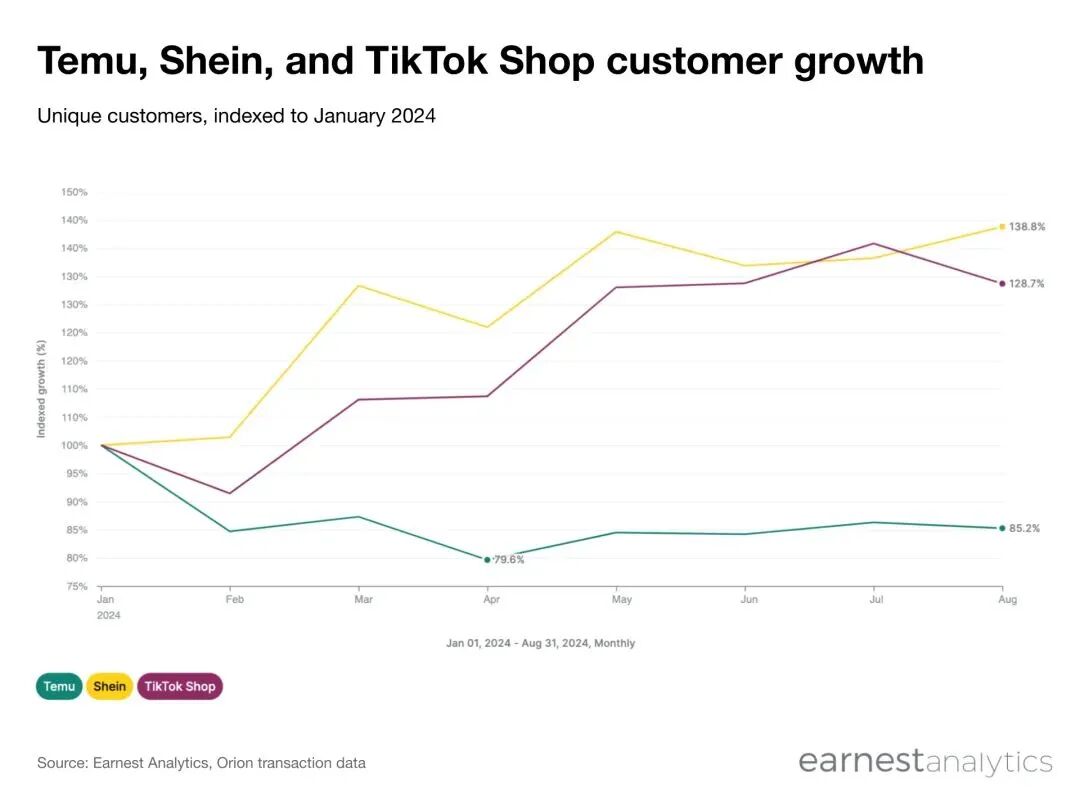 Shein和TikTok Shop的客户量在2024年,前8个月均实现了增长,Shein增长138.8%,TikTok Shop增长128.7%。