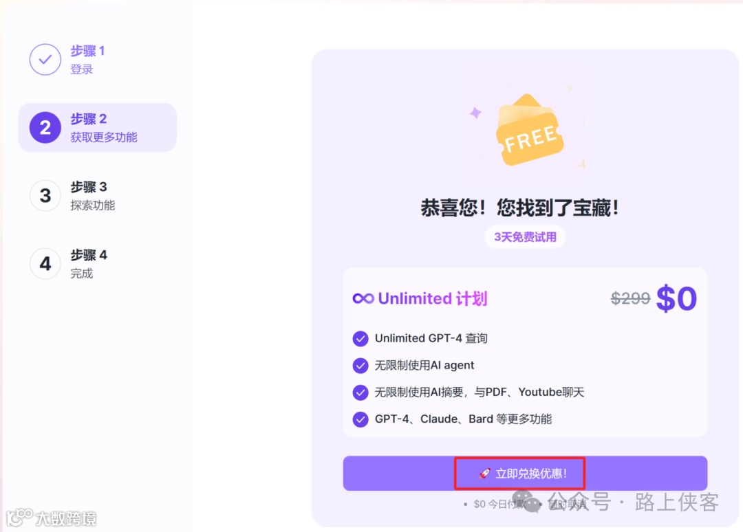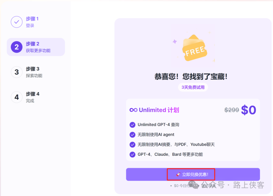 现在注册,即可免费获得 100 个 GPT 查询,包括 GPT-4、GPT-3.5 和 AI 绘图。