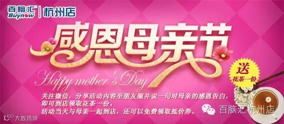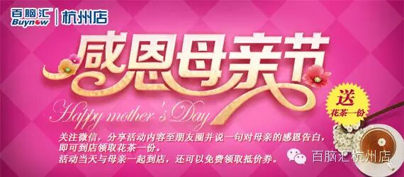 即日起,关注百脑汇杭州店微信,转发活动至朋友圈,或登录官网获取活动短信,母亲节即可到店领取精美花茶一罐!!!与母亲同时到店,还可以享受免费贴膜哦~~~更多精彩就在5月11日