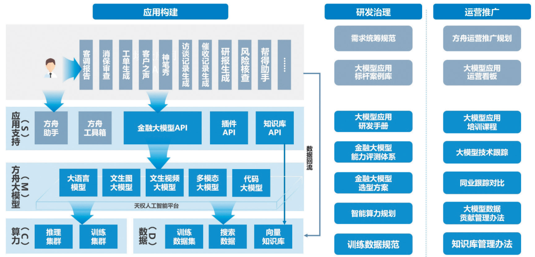 1.三大基石形成强应用支撑。运用金融大模型在多轮对话、逻辑推理、文本生成、情感搜索等方面的优点,建设银行已成功研发投产方舟助手、方舟工具箱、向量知识库三大基础应用。方舟助手为员工提供业务知识问答、文案写作、表单填写、客调报告生成等多样化功能。方舟工具箱是方舟助手的“技能编辑器”,以无代码的开发方式让具有简单基础的员工应用各种行内提供的“人工智能工具”,快速构建服务自身工作、属于自己的“智能体”。向量知识库是方舟助手、方舟工具箱的“专业图书馆”,提供了海量的金融大模型可理解的向量化行内业务知识。