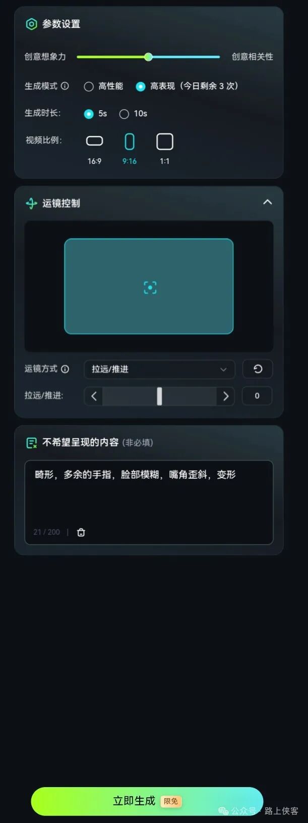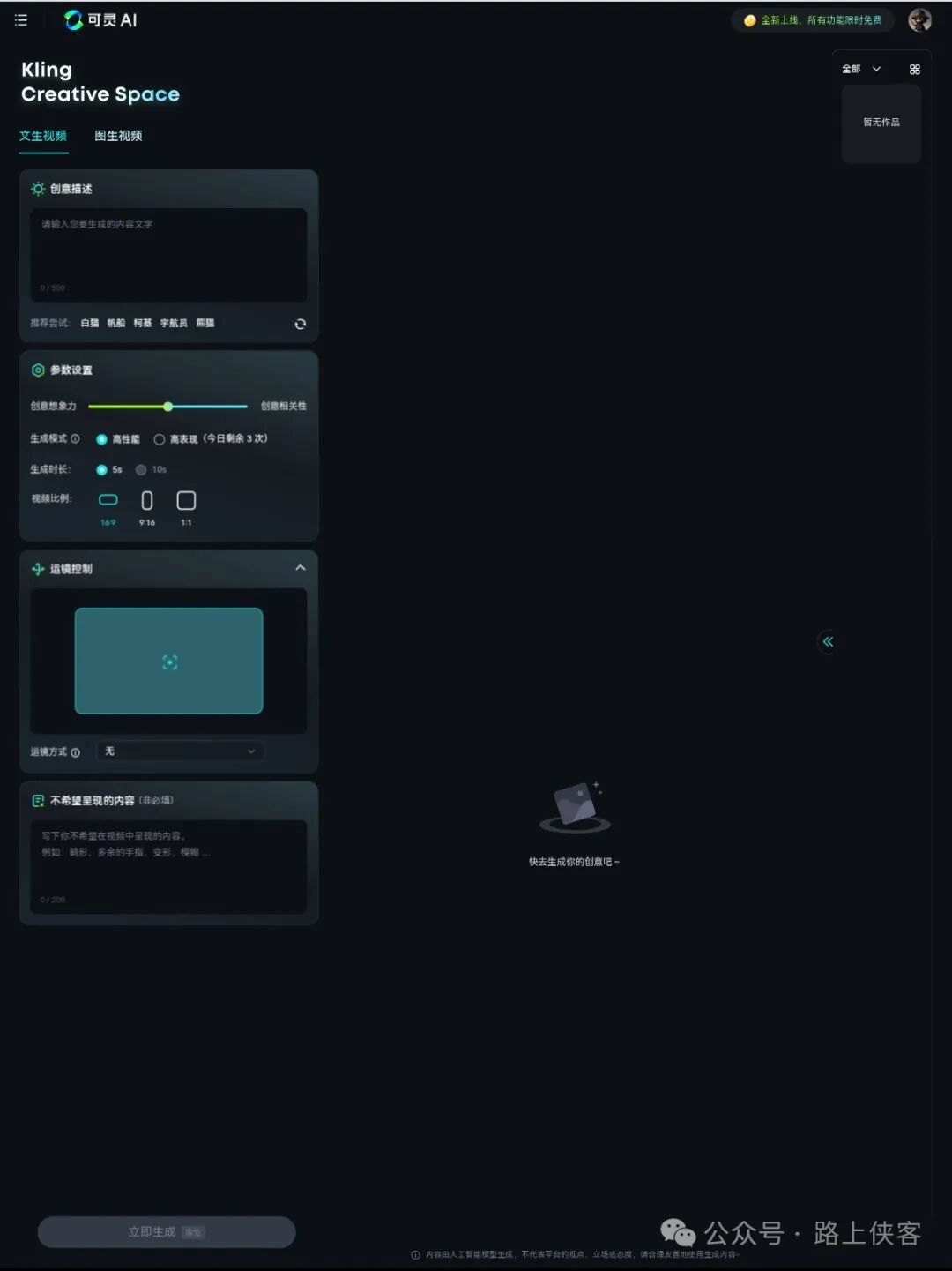 整个使用界面基本上和移动手机端差不多,增加了额外的一些设置,如运镜和不希望出现的内容(负面提示词),图生视频增加了收尾帧的添加。